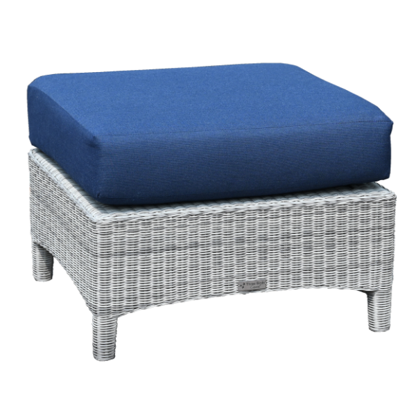 The ottoman features made in house cushions which are filled with Dacron cores and are wrapped in Sunbrella® fabric, providing comfort, weather resistance, and vibrant color that will last for years.