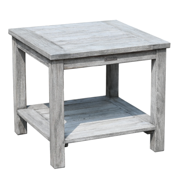 The Shelburne 22" Side Table with Lower Shelf by Three Birds Casual brings rustic charm and functionality to any outdoor setting. Crafted from heavy, thick teak wood that comes pre-weathered, this side table provides the iconic silver color of weathered teak without the wait. Its sturdy design makes it suitable for both residential and commercial spaces. The lower shelf offers additional storage or display space, making it both practical and stylish. This side table pairs wonderfully with gray deep seating pieces, making it a versatile addition to modern patios, gardens, and commercial outdoor areas.