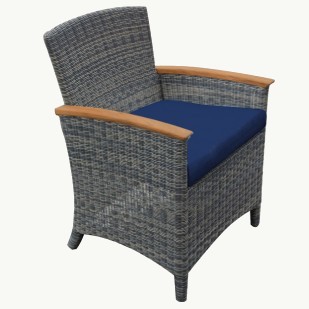 The armchair features luxurious Plantation teak accents on the arms, adding a touch of natural elegance to the design. The seat and backrest are complemented by custom-made cushions filled with foam and Dacron cores, all upholstered in premium Sunbrella® fabric. This fabric is not only fade-resistant but also easy to clean, ensuring that the Bella Dining Armchair maintains its comfort and appearance season after season.